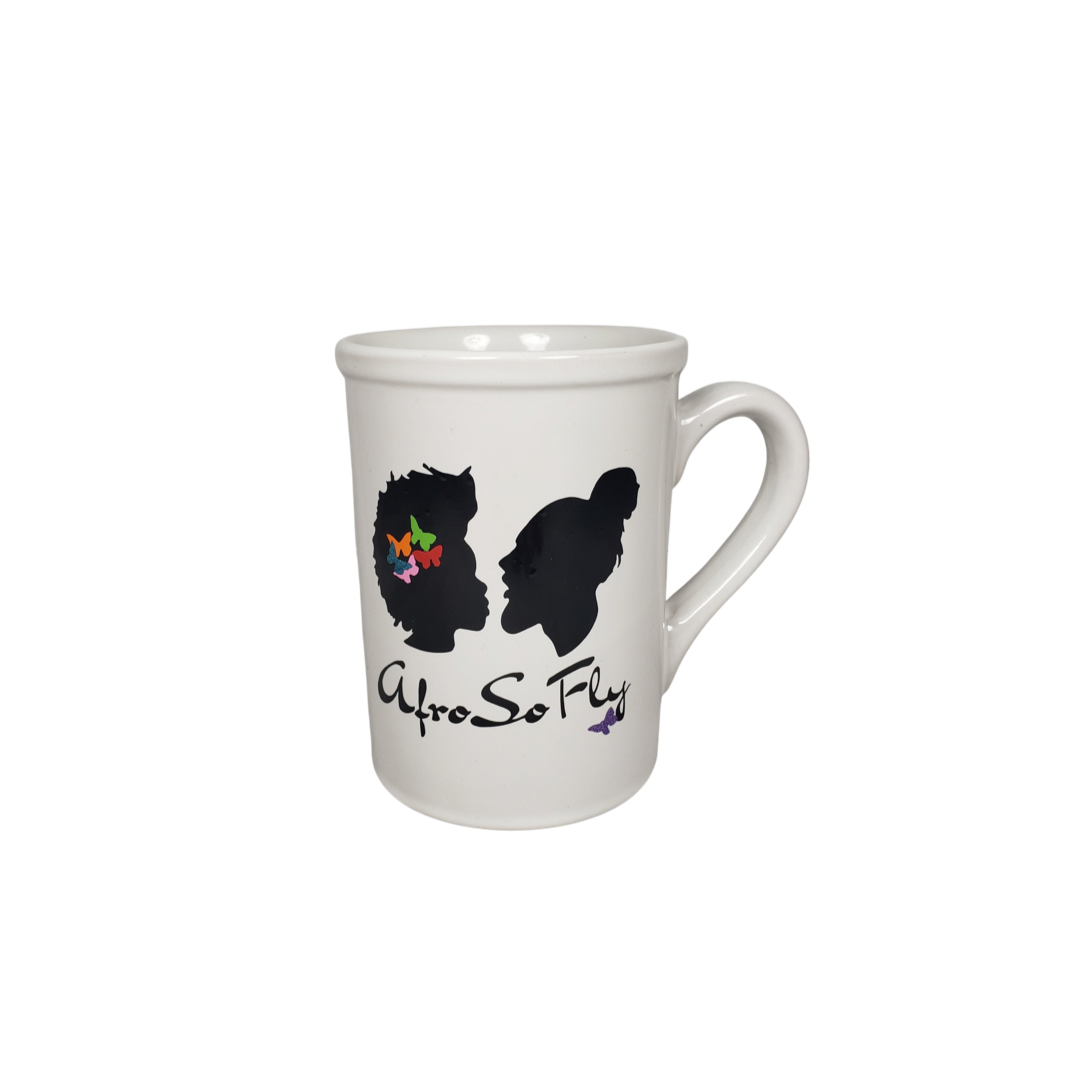 An oversized Afro Kiss mug featuring, “Ready,” an excerpt from Pink Lotus by Dominique D. Glisson.