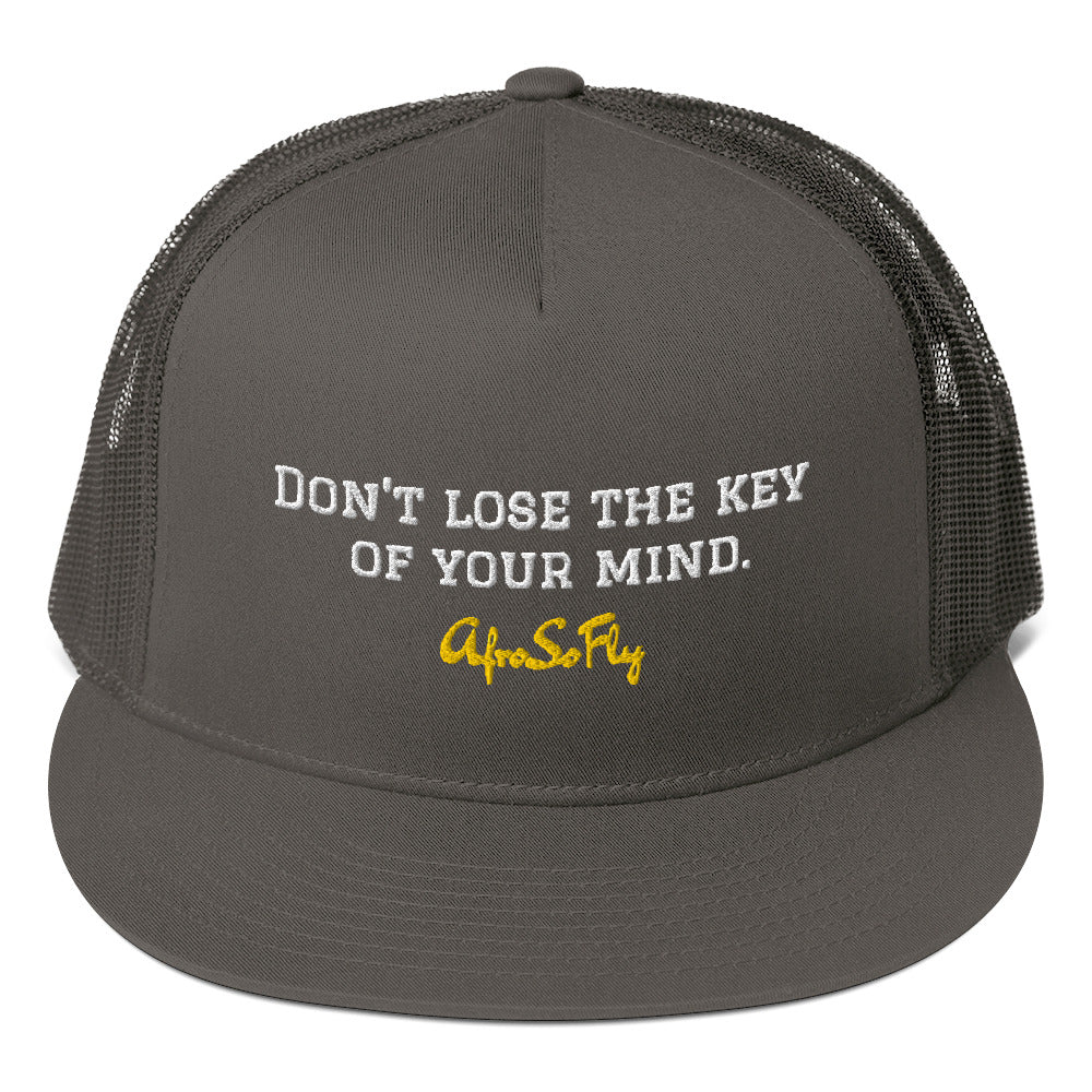 A classic charcoal gray snapback with a polyester mesh back and white/gold text.